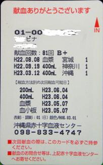 検査用の採血まで少し待ったけど、津波のニュース映像を見ていたので、全く気にならなかった。思いのほか、皆がテレビを注目していないのは、やはり東北(or内地)との距離感なのだろうか。採血も特に沖縄だから内地と違う・・・ということもなし。採血が終わって看護婦さんから「このあと1時間ほどお待ちいただきますが、外に出られますよね?」と言われた。本当は午前中、現場をたくさん歩いたので、座ってテレビを見ていたかったけど、混んでいたし、ネクタイしてるのおいらだけで、ちょいと居心地も悪かったので(笑)、「はい。」と外へ出る。 国際通りも近いので、町おこしでちょっと有名になっている「桜坂劇場」(映画館)までお散歩。なかなかおしゃれなビルだがガランとしていた。一方、牧志の公設市場辺りは土曜の日中とあって、観光客・修学旅行生らしき人たちがわんさかといた。 1時間ほど時間をつぶしてルームに戻り「戻りました」と声をかけると、すぐに採血ベッドへ。 【採血】採血ベッドは10台ほどか。一番奥のベッドへ。手順も特段変わったことはなし。テレビ画面では津波のニュース。まあ、この時間はどのチャンネルを回しても地震・津波以外のニュースはやってないだろうけど。ここひと月ほど、よく運動しているせいか、血の出方も早いみたい。6分ほどで採血終了でした。(前回よりも1分ほど早かった(笑))前回、溝の口のルームでは、採血後に手首血圧計で血圧検査をしたけど、今回はなかった。ここが唯一の違いかな。 【採血を終えて】 小腹もすいたので、タンナファクルーを一つ頂いていると、名前を呼ばれた。立とうとすると、受付のおねぇさんが、「どうぞ、そのまま。今、お持ちします。」と献血カードとお土産の入った袋をくれた。 お土産は、haro- ハローキティとけんけつちゃんのクリアファイルとボールペン。クリアファイルは、けんけつちゃんが47都道府県を代表する恰好をしている。沖縄は琉装だし、東京は頭に東京タワーを乗っけてる。神奈川はサーファーだ・これはかわいい。 最後に預けておいた荷物を受け取ると「長いお時間を戴き、大変ありがとうございました。」と2人がかりで頭を下げられちゃいました。 同じようなことを考える方も多いようで、献血者が増えたそうです。献血後、週明けの日赤のHPには次のようなお知らせがありました。 「日頃より日本赤十字社の血液事業にご理解、ご協力をいただきありがとうございます。 また、平成23年3月11日(金)に発生しました東北地方太平洋沖地震に伴い献血へのご協力をいただいておりますことを深く感謝申し上げます。皆様からのご協力によりまして、現時点(3月13日現在)におきましては、医療機関からの需要に安定的に血液をお届けできております。 しかしながら、血液製剤は有効期限があることから、一時期に献血者が集中すると、期限切れが発生し、医療機関への安定供給に支障をきたす恐れがあります。皆様からの善意の献血を無駄にすることなく最大限に被災地の医療に活用するため、一時期に偏ることのない継続的な献血が必要でありますので、何卒ご理解のうえ、今後とも献血へのご支援を賜りますようよろしくお願いいたします。(以下略)」 |