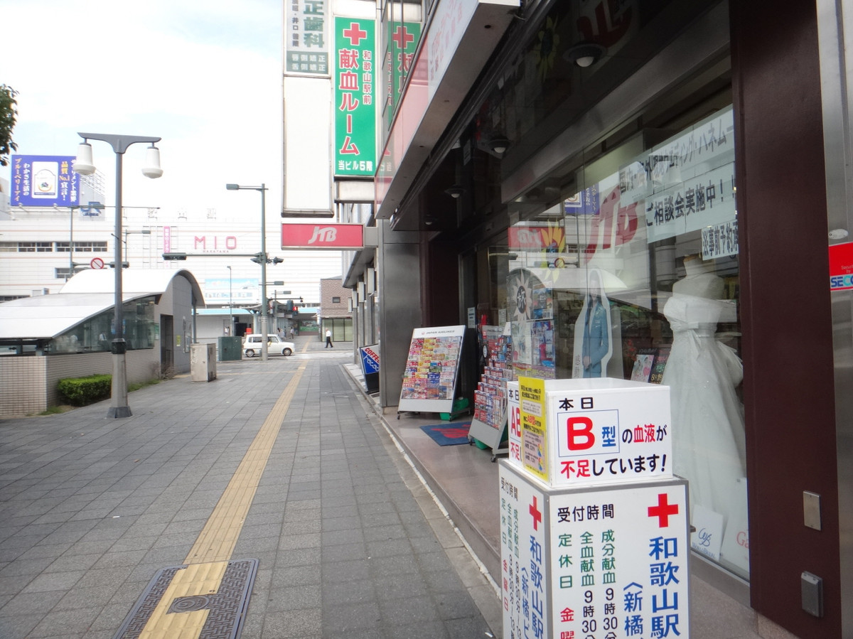 神戸に転勤してきて早11ヶ月。この間、神戸、梅田と献血をしてきて、さて、次はどこにするか。 近畿地方、奈良・京都はかなり前に観光で来たときにやってるので、残るは和歌山と滋賀。 滋賀は、これからも行く機会があるだろうけど、和歌山はその気にならないといけない気がする。 ってことで、「そうだ、和歌山。行こう。」と献血へ。 【献血ルームへ】 和歌山での献血はどこでできるのか? ググると、和歌山県内の固定ルームは、JR和歌山駅前の一カ所だけだそうな。こりゃ少ない。乗り換え案内によれば、自宅から、阪神電車で西九条乗り換えが最も安いらしい。所要時間は2時間40分ほど。日曜の午後で、市営地下鉄、阪神電車、JRともゆったりと座っていけた。JR阪和線は初めて? の筈。 和歌山駅に到着。駅の真ん前と言うことで、特に地図も確認していかなかったが、ロータリーがあって、ちょっとややこしい。当てずっぽうで歩くと、すぐに見つかる。ビルの5階。 ビルの入口に四角柱の看板があって「ただいまAB型が不足しています」と書いてあった。何だ、AB型かぁ、とちょっと残念になったのだが、四角柱の他の面には「A型が不足」「B型が不足」と、結局、全血液型が不足なのね。 【受付】