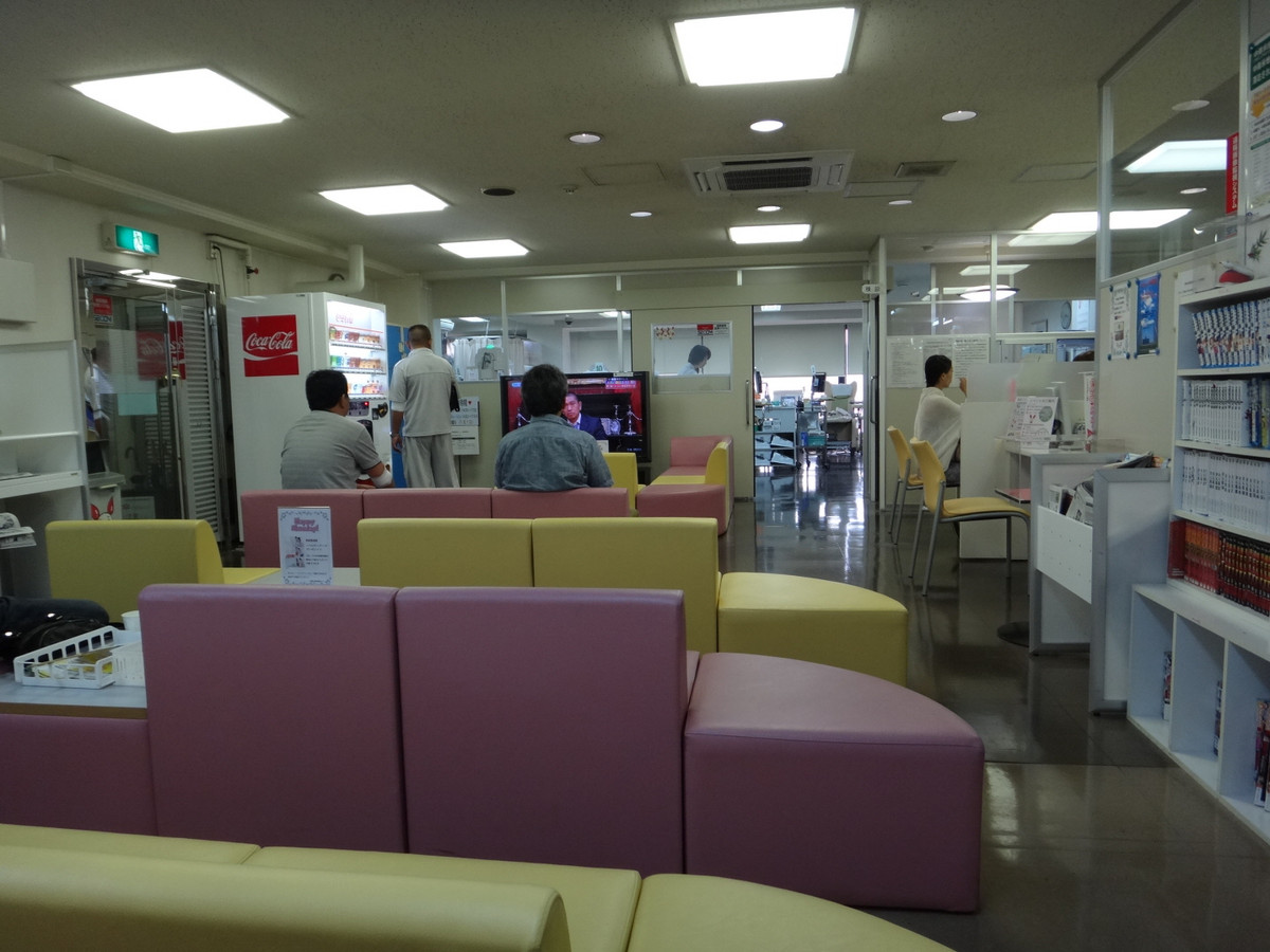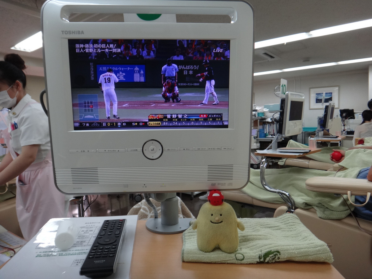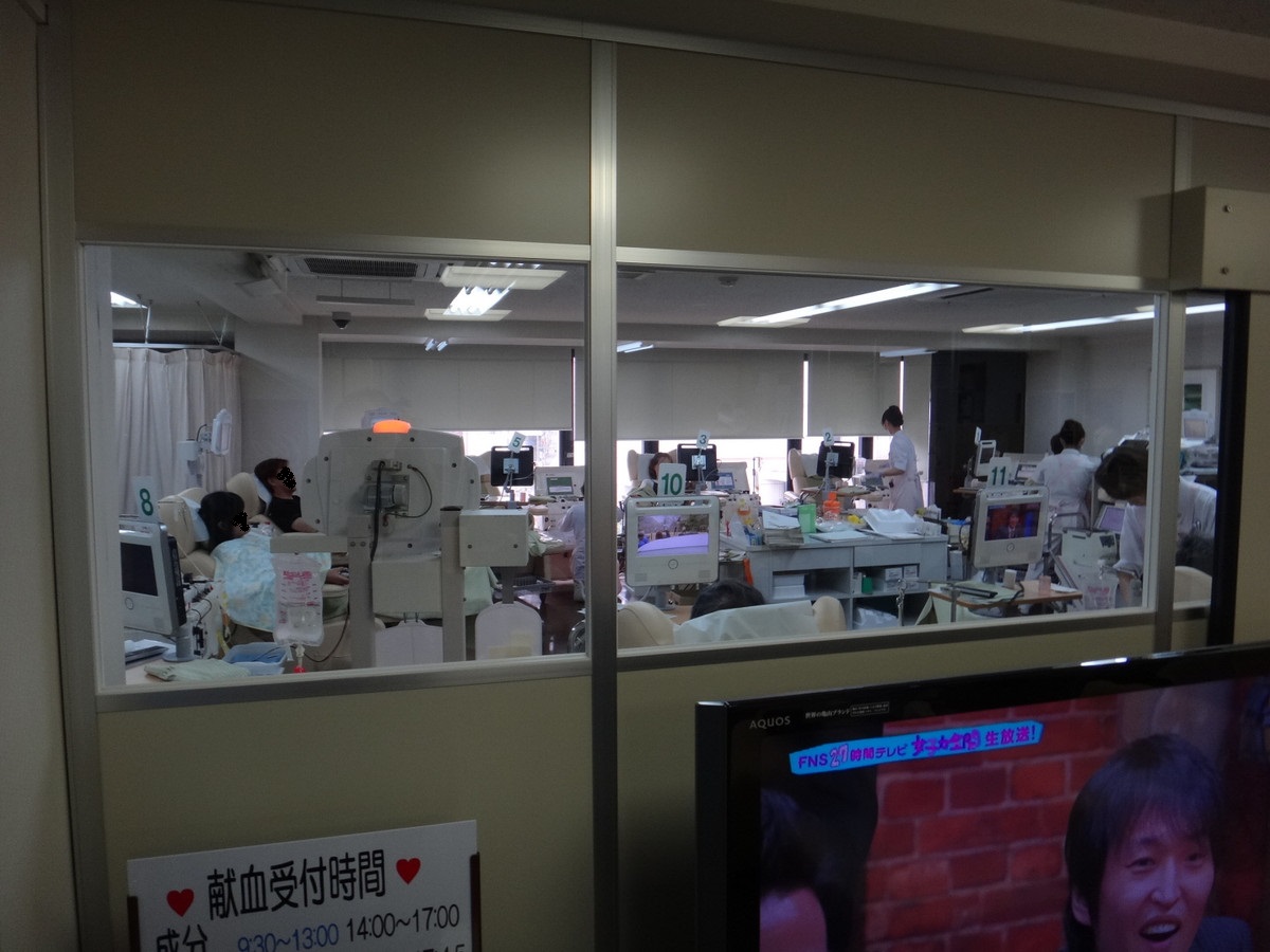 15:30、ルーム到着。こじんまりしたルームである。受付のお兄さんのカードを渡すと、全血か成分かを聞かれる。全血と応えると、検査待ちに20分ほど係るとのこと。こちとら、これだけのために和歌山まで来てるので、問題なし。 暗証番号をテンキーで入れたら、住所、食事、睡眠時間の確認、体重はなぜかテンキーで入力。人前で体重なんて言えない女性に配慮しているのだろうか。 そのまま、受付カウンターのタッチパネルでお約束の「はい・いいえ」。今回、南米の渡航歴を改めて聞かれた。 そうそう、愛知や大阪でやる「シーフテスト(手のしびれのテスト)」は、和歌山では導入されていませんでした。 一連の受付が終わり、「自販機で、水分を取って下さいね。」。カップ式の自販機が飲み放題。ただし、食べ物はなし。「食事がまだ・・・」と言えば、何かくれたのであろうか。 ロッカーに荷物を入れ、採決前なので、暖かいコーンスープを頂く。 テレビでは「27時間テレビ」。 【問診】ほどなく、問診。個室だけど、扉がないので、話は筒抜け。年配の野菜そうな男性の先生でした。チェック項目を再確認して、血圧測定。こいつも、特に問題なし。それでは今日は400で。 【検査】