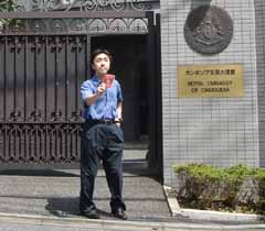 申請。急な坂道の途中にあるカンボジア大使館。前庭に小さなおやしろ。ビザセクションは門を入って左。狭い待合室に昔の病院の受付のような小窓。申請窓口にはお姉さん一人、交付窓口にはお兄さん2人。