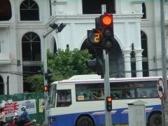 クルマは右側通行、フランス流ですな。ラウンドアバウトもあった。信号機はシェムリアップの街に5箇所。導入時は反対が多かったが、実際に付けてみると便利ということで2箇所増設したそうな。赤信号でも右折はOK。青信号・赤信号ともに「あと何秒」の表示が出る(写真左)。