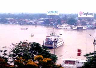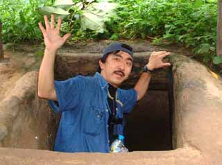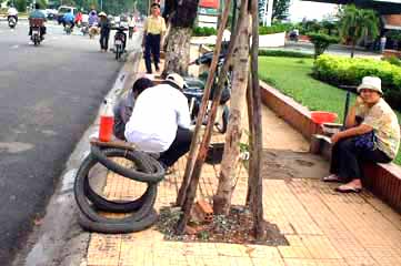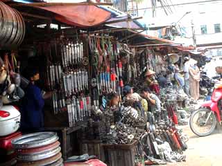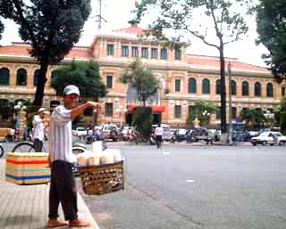 どんな旅だったか1日目(2004/8/18(水))1155 自宅発、大井町線、都営浅草線、京成線を乗り継ぎ成田へ成田エクスプレス経由の半額以下。30分ほどよけいにかかる。座席予約ができないことを除けば問題なし。実際この日は自由ヶ丘から成田まで座って行けた。 荷物は、一番小さいスーツケースとウェストポーチ。スーツケースの半分はカラ。大きめのリュック一つで足りる着替えしかないのだが、セキュリティが判らないので、ハードケースにしたのだ。 現金は300ドル。残りはcitibankのカードで賄うつもり。(別に、日本円を2万円。) 1410 成田空港着、HIS、ANAチェックイン、昼食 民営化後、初の成田空港。レストランが少し高くなったような気がする。 海外旅行のお約束、成田でまずビール一杯。この日も、鮨で一杯引っかける。 その後、yahoo!の無料インターネットカフェで時間をつぶす。中国系の人が多く使っていた。日本人は2割以下かな。 1750 搭乗 滑走路まで延々と地上を走り、実際に飛び立ったのは1840。飛行機は767-300。座席は、エコノミーの最前列、中央ブロック通路側。まずまずの位置。 となりはベトナム人のおばさん。自分の機内食をおいらに奨める。ありがたく頂き、ワインをお代わり。飛行時間は6時間程度。 飛行機の中では、ベトナムの本読んだり、映画(ザ・デー・アフター・トモロー)見たり。 2210 ホーチミンの空港着、現地は雨 飛行時間は6時間弱。定刻着。ベトナム人って、飛行機が止まらないのに、我先にと荷物を降ろして通路に並ぶ。お国柄なのかな。 ベトナムは社会主義国。くつかの旅行記に「入国審査官が偉そう、無愛想、やる気無し」とあったのでドキドキして入国審査。いつものとおりバスポートの写真(少し笑ってる)と同じ表情で審査官を見つめる。おいらの顔とパスポートを見比べて「OK、OK」とニコニコしてスタンプを押してくれた。 テロリストを水際で防ぐ仕事、しかも30年前まで戦争中。目を合わせない旅行者や列も作らないおっさんに厳しいのは当然だ。 荷物は待つこと20分、ようやく出てくる。 ベトナムの通貨はドン。1万ドンが70円ほど。空港内で50ドル分だけ両替、76万ドンほど。3万円も両替している若い女性もいたが、何に使うのだろう。 2325 ホテル着・就寝 現地ガイドとすんなり接触、バスでいくつかのホテルを回り、おいらが泊まるサイゴン川沿いのその名もRiverside Hotelに投宿。ロケーションは抜群、施設は古いが十分許容範囲。 冷蔵庫の中の缶ビール333(バーバーバー)を一本開ける。ちなみにビール1本=16,000ドン=110円、コカコーラが15,000ドン(笑) 就寝は1時、日本時間では真夜中の3時。 2日目(8/19(木))0630 起床すんなり目覚める。これも時差ボケみたいなもの。 0730 ホテル周辺を散歩 上の写真の通りの道路事情。オートバイは数も多いし、運転が荒い。オートバイは、決して安いものではなくて、HONDA(ベトナムではバイクの代名詞になっている)100ccの新車が30万円なのだそうだ。輸入車は100%関税。今は中国製も入っているそうだが、それでも4,5万円というから、生活費から考えると高価な買い物だ。 3人乗り、4人乗りはザラ。5人乗りまでいたぞ。 道ばたには、露天の修理屋が出てる。(右写真、タイヤを組み合わせたものが「ただいま修理屋開業中」の看板代わりになっているのだ。) ノー・ヘルメットは罰金2万ドンだそうだが、装着率は5%以下に見える。女性はノーヘルでも帽子、マスク(覆面)に袖まである手袋で武装。事故よりも日光が怖いのか。信号機はある。歩行者用信号など、日本のとおなじものも。しかし、それを守るわけでもなく、クルマがこなけりゃ「行って良し」という感じ。赤信号で止まっても、青になるまで待てない。最近日本で見る「信号変わるまであと何秒」の表示があったのにはビックリ。 そんなホーチミンの道路。朝夕の通勤ラッシュに渡るのは命がけ。「一生渡れないんじゃないか?」と思うくらい。最初は現地の人を楯にして歩く。これを2,3回やって気づく。走ったり、立ち止まったりしなけりゃいいのだ。 一定のペースで歩けば、クルマの方でよけてくれる。向こうはこの混沌に馴れているのであるから、お任せするのが一番。一緒になった日本人に伝授したところ、みな無事に旅を終えているので「間違いない。」 0930 ミニバスにてホテル発(1時間遅れ(汗)で1日ツアー開始) フェリーの船着き場なぞを見て8:25ホテルに戻る。この日の市内観光は8:30にロビーでピックアップのはずだが、ガイドは現れない。ベトナム時間なのだろうと、しばらく我慢。それでも来ない。15分経ち、他のツアー客もいなくなり、だんだん不安に。20分経ったところで代理店に電話。「まだ来ないぞ。」「調べるから待て。」 待つこと10分。フロントに電話。「渋滞にハマったらしい。あと15分待て。」 それなら最初にそっちから連絡すべきだろうに、こっちから連絡した電話代はこっち持ち。100円くらいだろうけど納得いかない。(納得いかないと言えば、この日チェッ