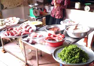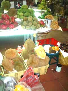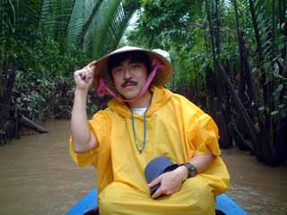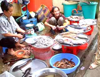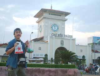 1145 3人乗りの小舟 フルーツも食い終わり、3人乗り(+船頭と漕ぎ手)の小船に乗り換えジャングルクルーズ。どこぞの遊園地のようにカバやゾウが出てきそうだが(笑) 船頭さん、最後までひと言もしゃべらず。歌ってくれとは言わないが、もうちょっと愛想があってもいいと思う。船頭さんと言い、歌姫達と言い、観光客ズレしちゃってるのか、そうでなければよっぽど馴れていないのか。対応は今イチ。雨季のためか、河の水は茶色く濁っており、こちらも余り良い雰囲気ではなかった。 1230 昼食。 メコン名物「エレファントフィッシュ(象耳魚)」を食す。あんな濁った川で採れる魚だが臭みもなく、淡泊でうまい。ウロコをつけたまま揚げてあり、パリパリと衣のようでGOOD。デザートには揚げ餅が出てきた。 海外に行くとき覚えておきたいのが「乾杯」に当たる言葉である。「チアーズ」「チンチン」「プロスト」「カンペー」「サルー」と各国様々。旅先の飲み屋で居合わせた現地のひとと、アイコンタクトを取りながらグラスを挙げて、ひと言叫べば、「のんべい、皆兄弟」である。 ところがベトナム語の「乾杯」が最後までわからなかった。ガイドに聞いてみても「ガンペー」と言ってみたり「ぼっちゃん」と言ってみたり。どうも怪しいのである。 この昼飯、隣で楽しそうにビールを飲んでいた地元の団体さんに聞いたが反応なし。彼らの仕草には乾杯に近い動作はあるが、一定のかけ声はなく(私の理解が間違ってなければ)相手の名を叫んでいるようだった。帰国後、検索したら「カーンリー」(北部)「クングリー」(南部)とあったのだが、とてもそのようには聞こえなかった。 1345 ミトー発 途中に工業団地。韓国企業の進出が著しいとのことで、ロッテリアあり。 1500 ホテル着 しばし、汗を流す。これから明日夜の出発までフリータイム。 1540 フリータイム。ホテル発 シェラトン前のインターネットセンターで隠密日記更新。日本語対応しているから大したものだ。1時間1.2ドルは、ひとり当たりGDPが388ドルのこの国では、1日分の収入相当。外国人のものなのだろう。おいらがいる間、バックパッカー達がIP電話を使っていた。 1610 人民劇場、人民委員会ドンコイ通り沿いにあるきれいな建物。中には入れない。特に人民委員会(市議会?)は夜はライトアップされる。 1630 地元の本屋・CD屋 絵はがき、地図、民族音楽のCDを購入。CD1枚3万5000ドン(250円くらい)。 1700 ベンタイン市場 1時間ほど、全体を見て回る。下の写真のように、食料品から衣料品まで様々なものが置かれている。内臓ばかり売っている店や魚を売る店もあるのに、冷蔵庫らしきものが見あたらない。大丈夫なんだろうか・・・。 冷やかしがてらTシャツやハス茶を買う。ここのTシャツ屋がDのキムちゃんだ。顔はかわいいが、商売はあこぎである。 右上は市場の南門の時計台。夕方のラッシュに必死の思いで市場の前のロータリーの真ん中に渡って撮ったものである。