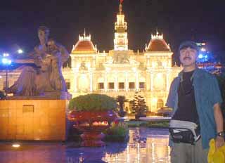 ベトナムコーヒーを呑みながら、絵はがきを書く。ベトナムコーヒーはクリームと砂糖たっぷり。とっても甘いのである。 1900 国営百貨店4階の土産物屋 置物系を冷やかす。かなり買ってしまう。ここの売り子さんは下のFの写真の人たち。 1945 人民委員会前で雨宿り 人民委員会、 市会議事堂のライトアップに見とれているとスコール。傘は役に立たないので、近くの軒先で雨宿り。ホーチミンは熱帯、8月は雨季の真っ最中。熱帯と言えばスコール。犬と猫が一緒に降ってくる勢い。しかも、いきなり。 街中を走る無数のバイクは。ポンチョでそのまま走り続ける人、とっとと雨宿りをする人。いずれも馴れたもの。 雨宿り。日本の夕立だと「本降りになって出て行く・・・」という川柳どおりだが、ホーチミンのスコールは30分きっかりで降り止む。滞在中3日ともそうだった。あれだけ降っても、降り止むと水たまりなぞどこにもない。バイクも歩行者も何ごともなかったよう。ほんのちょっと降っただけで麻痺しちゃう東京とはエラい違い。 2015 雨宿り中にガイドブックを読んでチェックした歌謡ショーの店ティエン・トードンへ ホーチミン市民の夜の娯楽の一つがカーニャック(歌謡ショー)だ。 雨宿りしていたところのすぐ近くに一つあった。殆ど予約席だったが、運良くあいているテーブルに案内された。 チャージが3万ドンで、飲み物は別注文。おいらは一番安い333ビール(4万5000ドン)を頼み、合計7万5000ドン=5ドル(笑) 日本のガイドブックにも載っているのに、英語を解する店員が殆どいない。トイレを聞いたら、英語が話せる店員が呼ばれてた。 舞台はそこそこ大きい。ドラム、ベース、キーボード、サックス、ギターのバンド。 20:50開演。客席はまだ2.3割。これもベトナム時間か。以下、歌手達のラインナップ。 1 江頭2:50をマジメにした風の男性。ど演歌。 2 胸元あらわな若い頃の今陽子。そんな格好なのにお辞儀の時には胸元を押さえる。残念。 3 白いスーツの男性歌手。歌はフリオイグレシアス風。 歌のうまさには圧倒される。ひとり2曲ずつだが、1曲にはサックスのソロがはいる。次の歌手の紹介は、前の歌手がやっているる。 4 月丘夢路風のおばさん。R&B、アンルイスのような世良公則のような歌いっぷり。3曲。 5 まるでマルシア。杏里と八神純子を足してそのままにした感じかな。 6 堂本剛風のおにいさん。ハウンドドックのような歌。 7 黒のミニドレスのおねーさん。前田美波里だぞ。アンコール有り。 ここまでで22時。缶ビール1本で1時間半粘っているのだが飽きない。あたたかいハス茶のサービスあり。気がつけば満席。スナックの類を持ち込んでいる客もいる。OKなのか? 8 革ジャンをきたキムタクみたいな顔の人。でも、歌はオトナになってからの郷ひろみ。 ジャンルはバラバラだけど、みんな歌はうまい。正統派。 チャージも高いので、年寄りか一世一代のデートの若者が来るのかと思ったが、男連れとか家族連れの姿が目立った。いずれのグループも、ノリの良い曲でも身体を揺らすわけでもなく、じっと座って聞き入っている。これもお国柄か? ようやく司会者が現れ、何かを話している。終わりなのかな? と思ったら次の歌手の紹介だった。 9 染五郎と新庄を足して2で割ったようなお兄さん。この日の目玉スター。歌は、西城秀樹風、田中星児風。 ファンの花束贈呈。歌い終わって舞台の下からじゃない。曲の最中に舞台に上がって、手渡して抱擁したり、接吻したりだ。渡す方も、貰う方も、そして、観ている方もごくごく自然に受け止めている。4曲目はゴッドファーザー愛のテーマ、布施明そっくり。 この時点で22:35。席に勘定書が来たので7万5000を払う。 司会者再登場。染五郎さんとしばしトーク。表情から察するに、司会が褒めちぎり、染さまが恥ずかしがっているようだ。これで終わりか・・・と思いきや 10 伊藤美咲みたいな黒のロングドレスのおねーさんと染様のデュエット。「忘れていいの」そっくり。。 ソロに戻って、7曲目は「シクラメンのかほり」調、8曲目は「積み木の部屋」風・・・と、すっかり布施明に。ってことは・・・、予想が当たった。9曲目は「そっとお休み」(笑) さらに10曲目「そっとお休みパート2」(爆) 2時間半のノンストップ歌謡ショーはめでたくお開き。ワンドリンク付きで600円。 2325 王将(餃子じゃないよ)で遅い晩飯 王将という名前でもわかる様に日本人の経営。フォーの看板が出ていたが、ビーフとツナのステーキを頼んだ。 0000 ホテル帰着、就寝 4日目(8/21(土))0630 起床、パッキング、朝食0830 チェックアウト この日はホーチミン市内を手広く回ろうと思い、タクシーで出発 0840 歴史博物館へ ホテルから10分、タクシー代14000ドン。入場料1万ドン。 勉強になる。ミイラまであるのに、全然宣伝してないんだもんなぁ。日本なら、あれ一体だけで目玉にできると思うんだけど・・・。 当然ながら日本語の説明はないが、まあ何となく判る。 1000 博物館